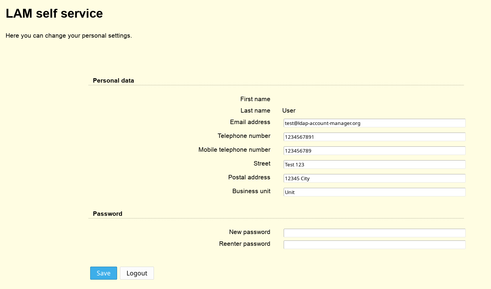 The self service provides a simple interface for your users to edit their own data (e.g. telephone number). It also supports user self registration and password reset functionality.
