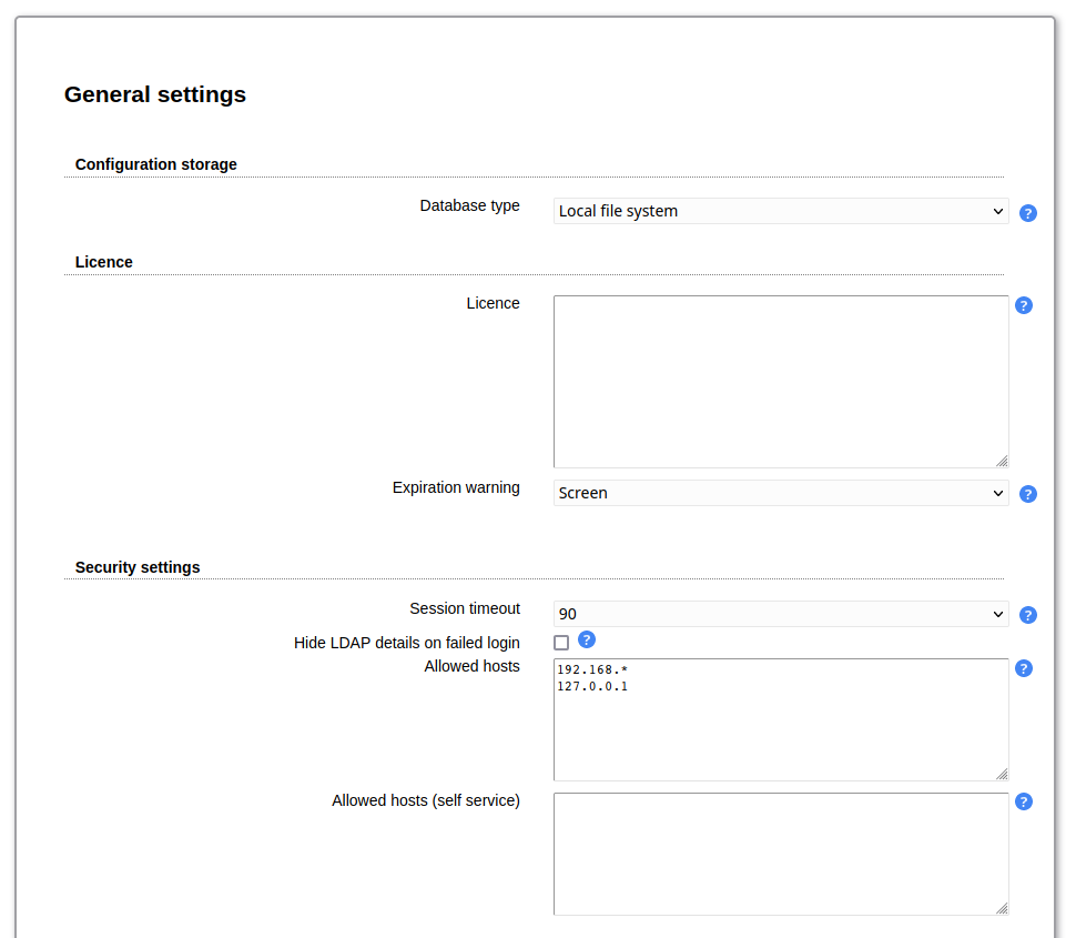 You may also set a list of IP addresses which are allowed to access LAM. The IPs can be specified as full IP (e.g. 123.123.123.123) or with the "*" wildcard (e.g. 123.123.123.*). Users which try to access LAM via an untrusted IP only get blank pages. There is a separate field for LAM Pro self service.