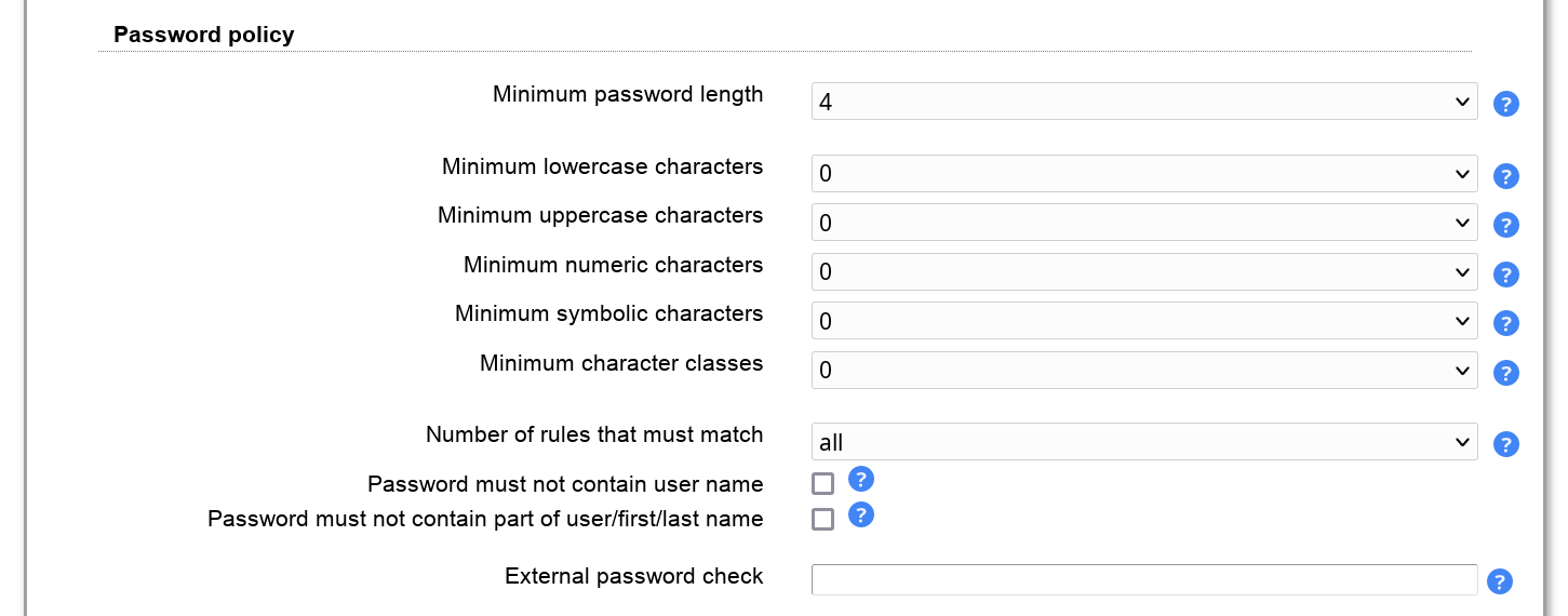 This allows you to specify a central password policy for LAM. The policy is valid for all password fields inside LAM admin (excluding tree view) and LAM self service. Configuration passwords do not need to follow this policy.