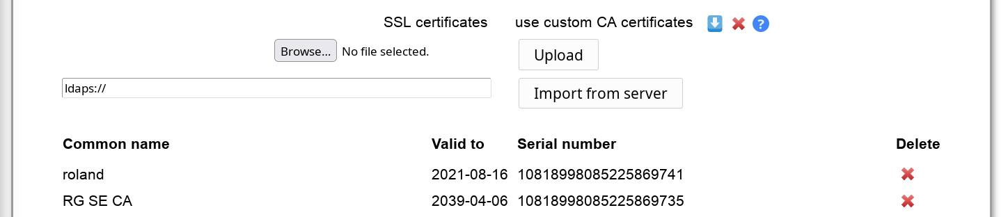 You can either upload a DER/PEM formatted certificate file or import the certificates directly from an LDAP server that is available with LDAP+SSL (ldaps://). LAM will automatically override system certificates if at least one certificate is uploaded/imported.