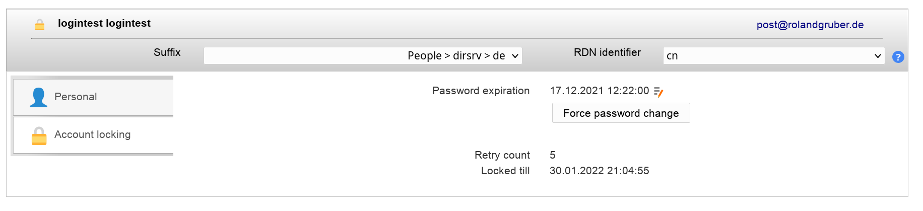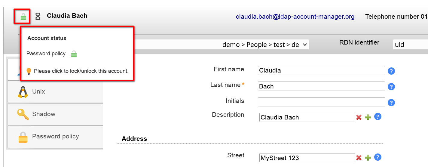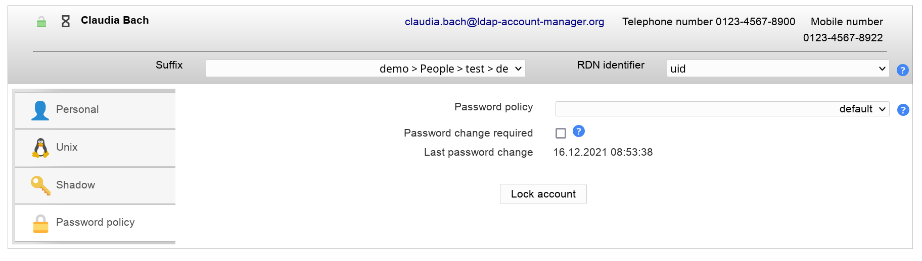 Note: Accounts are only locked by the LDAP server due to failed password attempts. You cannot manually lock an account. Deactivate it in case you want to disable login for a user.