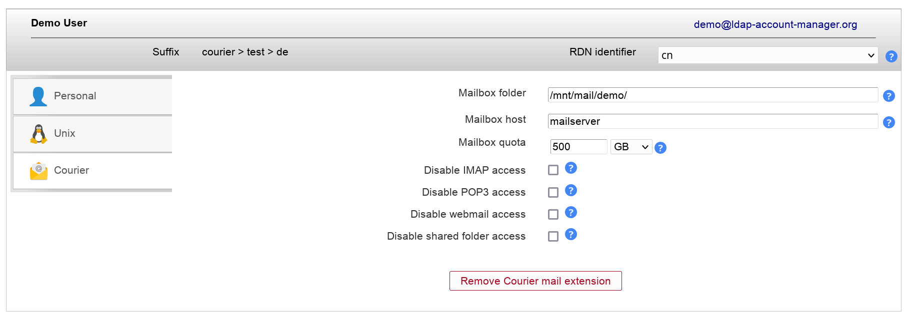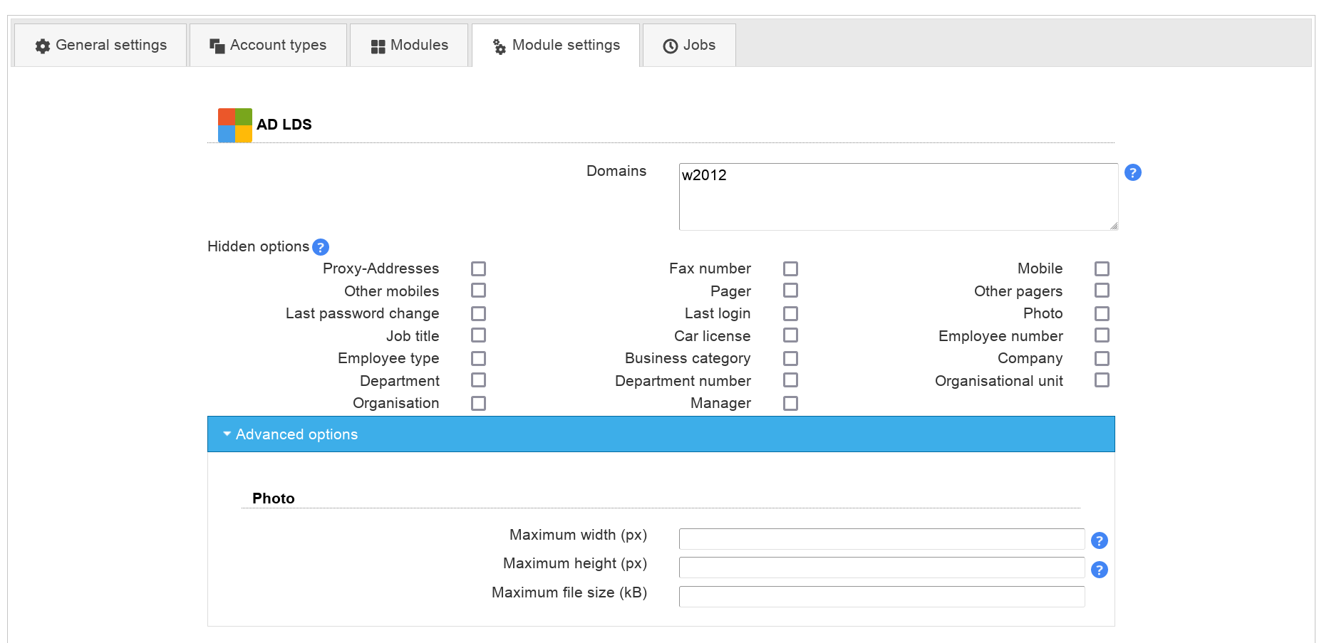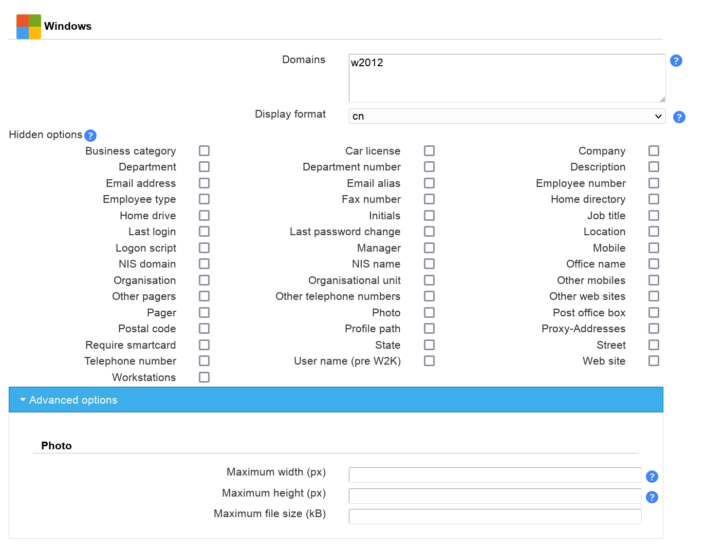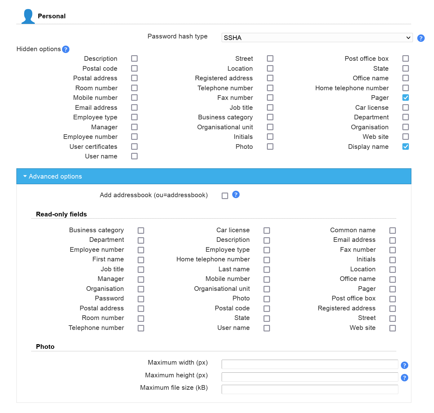 In advanced options you may also set fields to read-only (for existing accounts) and define limits for photo files. Additionally, you can add an "ou=addressbook" subentry to each user in case you manage user addressbooks.