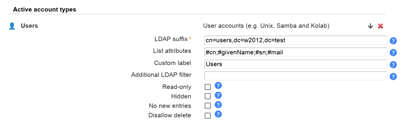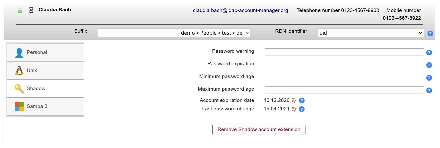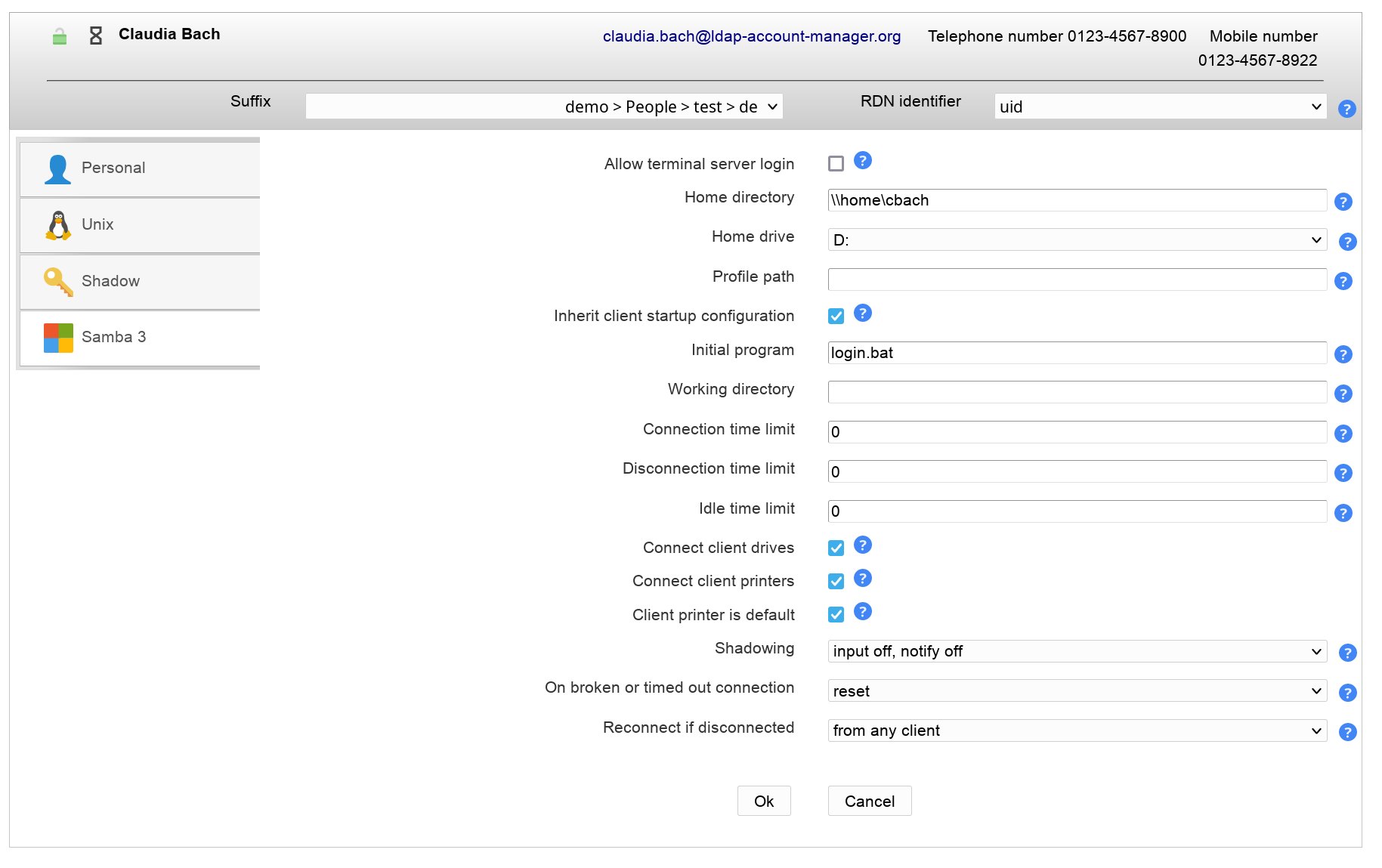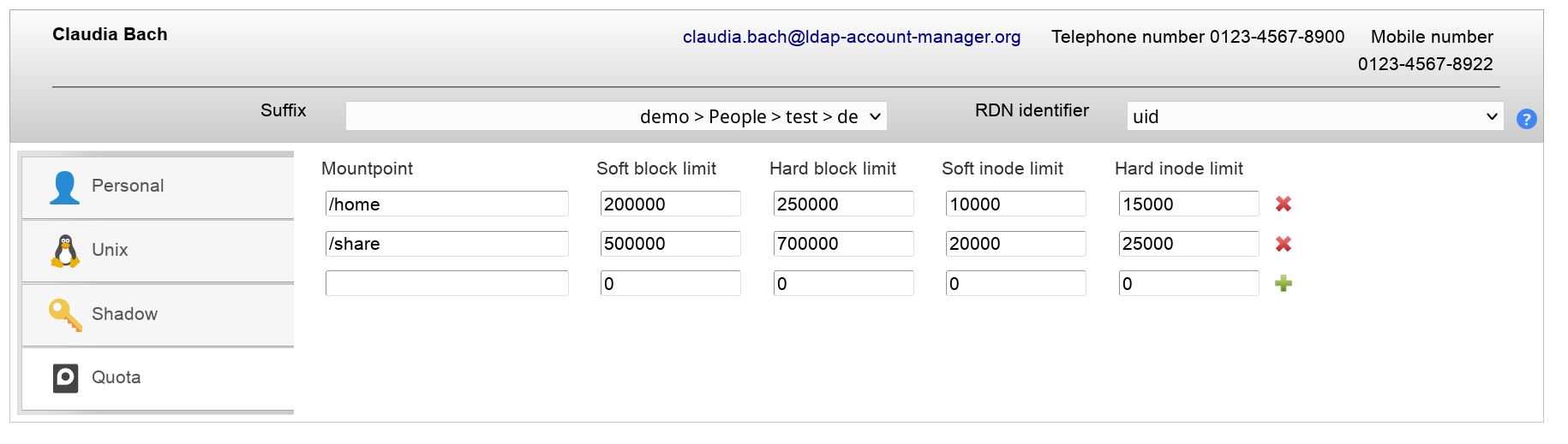 In advanced options you may also set fields to read-only (for existing accounts) and define limits for photo files. Additionally, you can add an "ou=addressbook" subentry to each user in case you manage user addressbooks.
