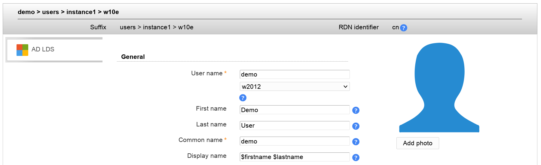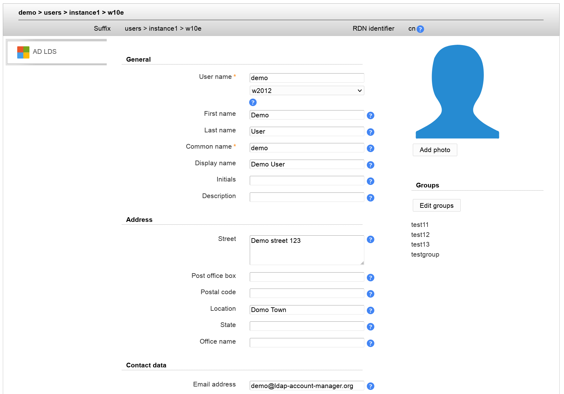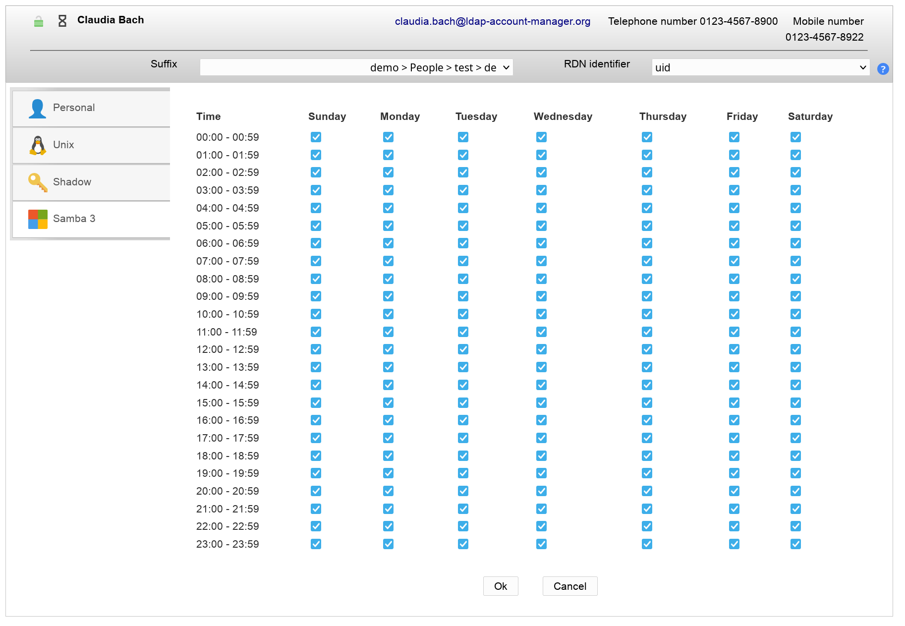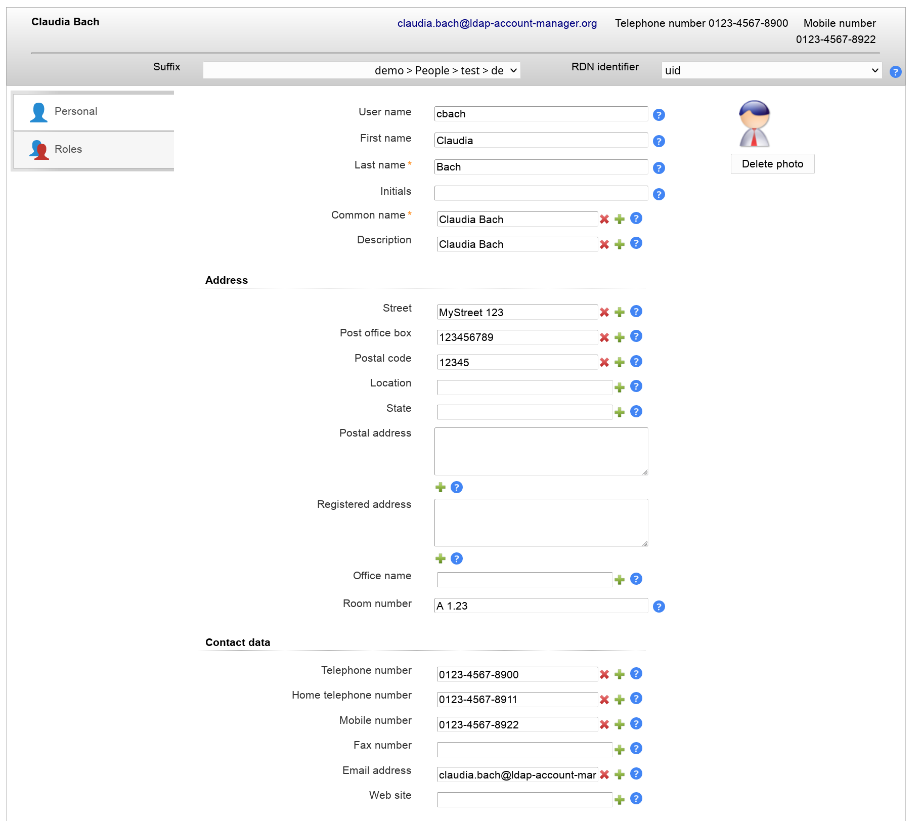 In advanced options you may also set fields to read-only (for existing accounts) and define limits for photo files. Additionally, you can add an "ou=addressbook" subentry to each user in case you manage user addressbooks.