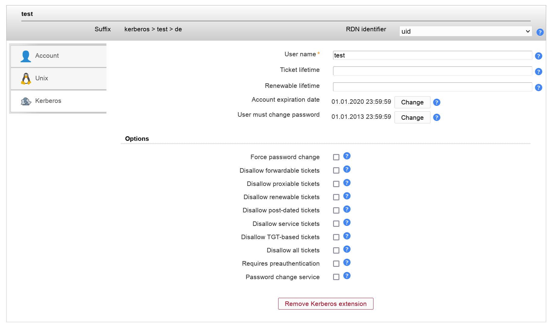 You can manage your MIT Kerberos accounts with LAM Pro. Please add the user module "Kerberos (mitKerberos)" to activate this feature. If you want to manage entries based on the structural object class "krbPrincipal" please use "Kerberos (mitKerberosStructural)" instead.