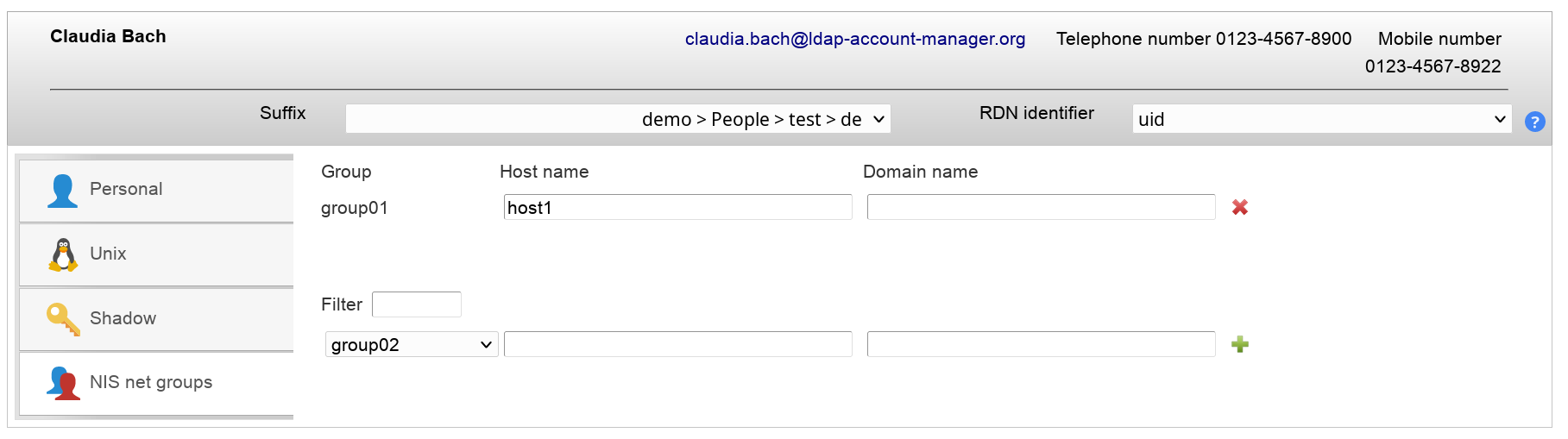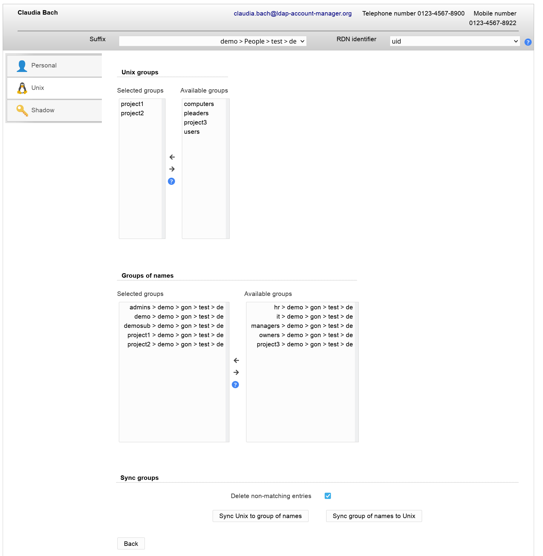 Group memberships can be changed when clicking on "Edit groups". Here you can select the Unix groups and group of names memberships.