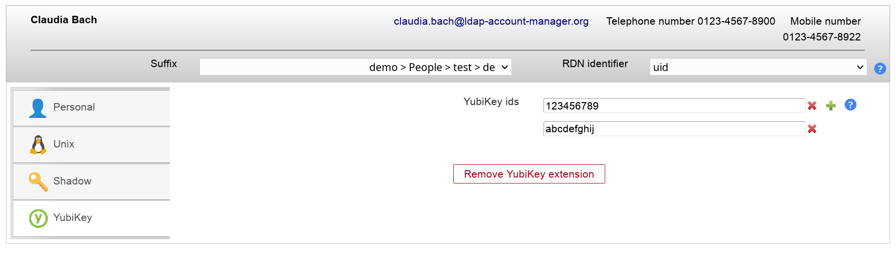 Object class: If you have an object class just for the YubiKey ids then enter it here. LAM will then provide options to add and remove it. In case you reuse some existing attribute from e.g. inetOrgPerson please leave object class name blank.
