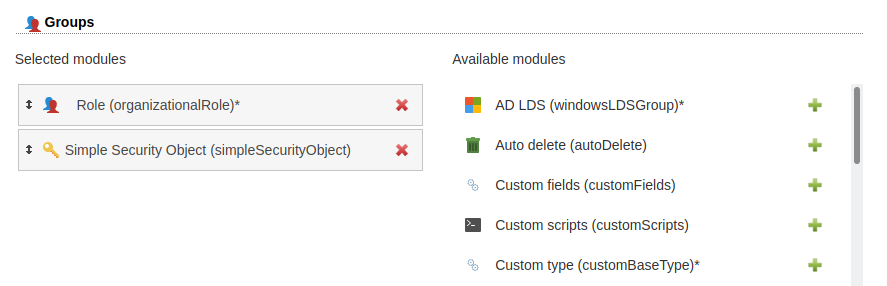 The simple security object module can be added to the following account types: users, groups, group of names and hosts