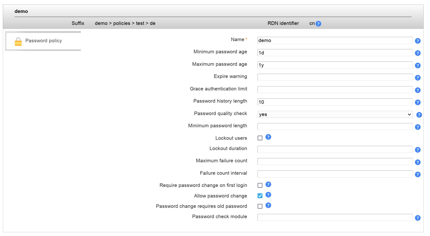 OpenLDAP supports the ppolicy overlay to manage password policies for LDAP entries. This allows you to set password policies which are independent from your applications. The policies are managed internally by the LDAP server.