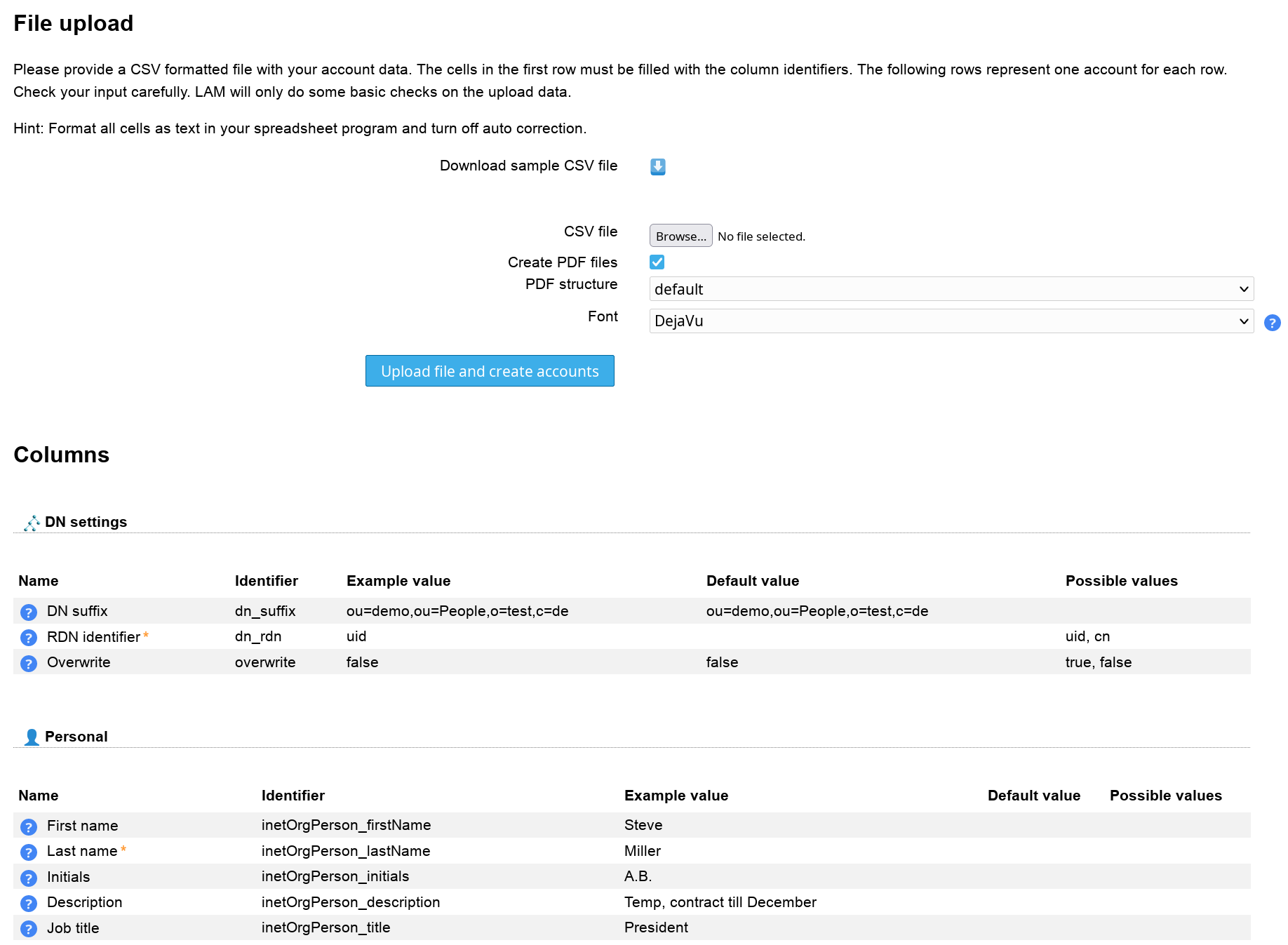LAM will read a CSV formatted file and create the related LDAP entries. Please check the data in you CSV file carefully. LAM will do less checks for the file upload than for single account creation.