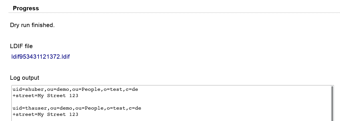 You should always start with a dry run. It will not do any changes to your LDAP directory but print out all modifications that will be done. You will also be able to download the changes in LDIF format to use with ldapmodify. This is useful if you want to adjust some actions manually.